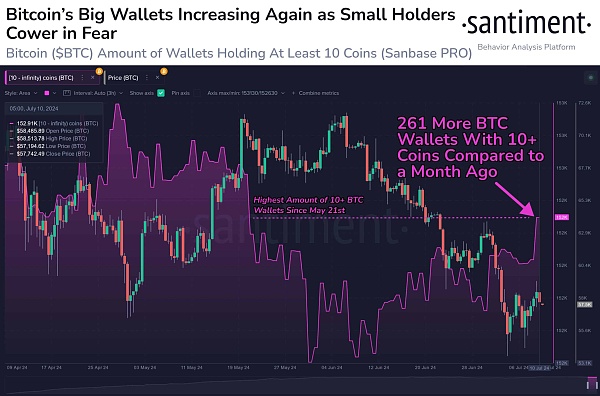 Santiment 的链上数据显示,比特币鲸鱼和鲨鱼钱包数量显著增加,7 月份新增 261 个持有超过 10 BTC 的钱包。