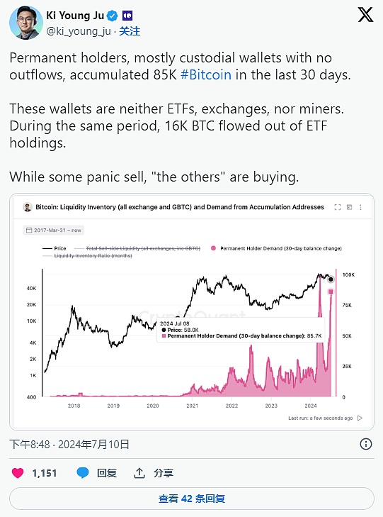 此外,CryptoQuant 首席执行官 Ki Young Ju 还表示,BTC 永久持有者(主要是没有流出的托管钱包)在过去 30 天内共积累了 85,000 个比特币。Ju 提到,这些钱包不同于 ETF、交易所和矿工。在同一时期,16,000 个 BTC 从 ETF 持有中退出。尽管一些市场参与者出现恐慌性抛售,但其他人正在积极购买。