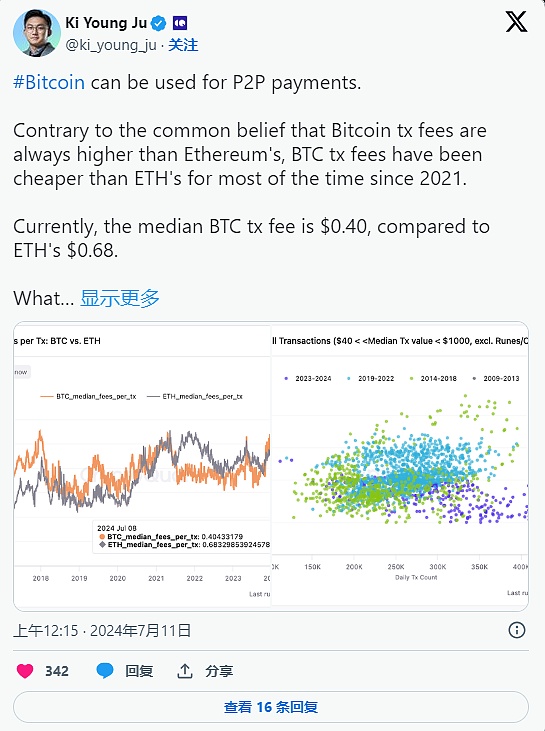 CryptoQuant 首席执行官还强调了 BTC 适用于点对点 (P2P) 支付。与普遍认为比特币交易费始终高于以太坊的观点相反,自 2021 年以来的数据显示,比特币费用通常较低。截至目前,比特币的平均交易费为 0.40 美元,而以太坊为 0.68 美元。