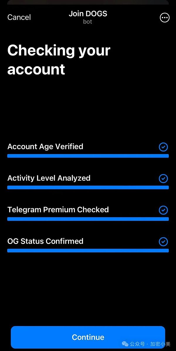 当进入 DOGS 的机器人频道后,它将会自动对你的电报 账号进行分析。账号的创建时间越长,其活跃度越高,所获得的积分也就越多。此外,拥有电报 的 Premium 账号也能够得到额外的积分。同时,通过邀请朋友加入,同样可以获取额外的积分。