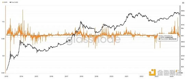 SOPR计算售出价值/买入价值,反映资产盈亏情况。