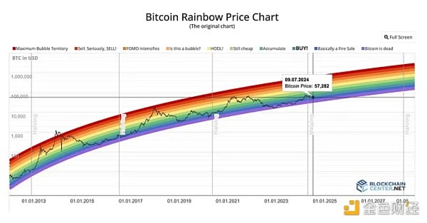 彩虹图使用对数增长曲线来预测比特币潜在的未来价格方向。