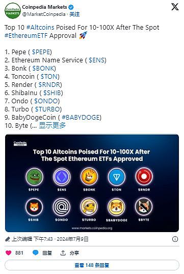 此外,该代币一直预测一些代币在 ETH ETF 获得批准后能够升至新高。名单包括 Pepe、Toncoin、Render、Ondo、SHIB 和 Turbo 等。
