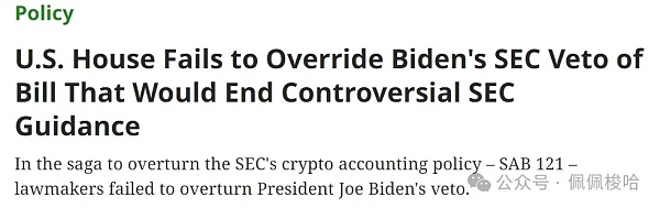 美国众议院就是否推翻总统拜登对SAB 121相关决议的否决权进行了投票,但未获通过,美国证监会的加密货币会计政策保持不变。加密货币立法民主党核心谈判代表之一、众议员Maxine Waters表示,美国证监会和银行业正在就改变有争议的会计政策进行谈判。