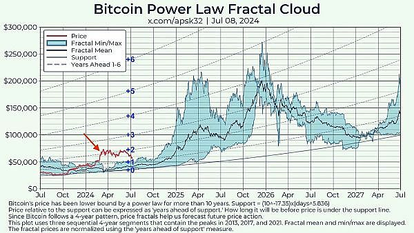 此前,为数众多的老韭菜、老炮、老KOL普遍形成一个“共识”,要趁着4月“产量减半”前后,BTC“必定”暴跌之际,“抄底”BTC。毕竟,2020年减半前,“312”大崩盘、BTC一溃千里的模样,在不少经历过那场惊心动魄的老韭菜心中留下了难以磨灭的印象。看图中蓝色条带,在3月迅速向下方的幂律支撑线逼近。更可怕的是,过往几轮周期,几乎在这个时间点,都是贴着底线在爬。
