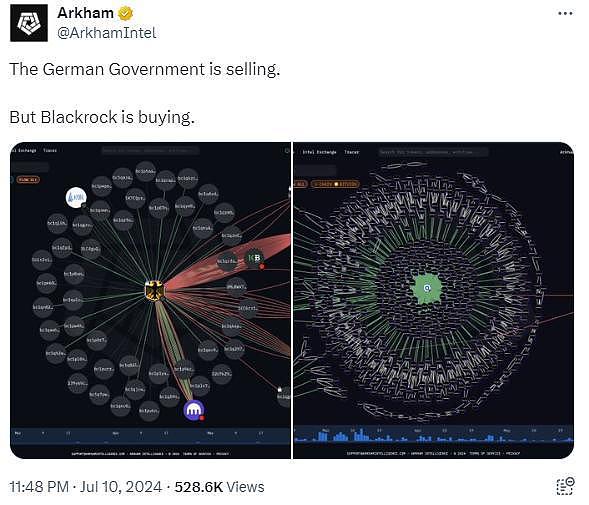 此外,Arkham进一步验证了巨鲸囤积理论。具体来说,贝莱德(Blackrock)的钱包近几个月一直在积极收购德国政府抛售的比特币。