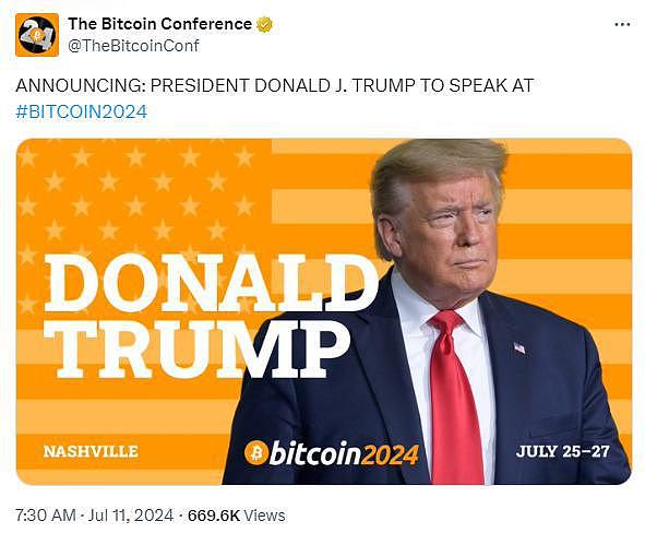 The Bitcoin Conference官方推特账号证实,特朗普将在今年比特币大会(Bitcoin 2024)上发表讲话。随后,Bitcoin Magazine、CoinDesk等知名币圈媒体也跟进报道了此事。