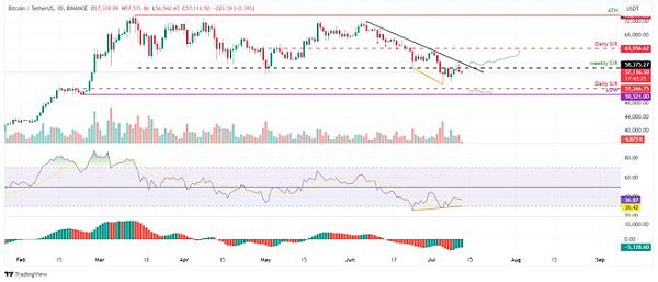 Manish指出,本周,比特币在58375美元的周阻力位附近遭遇阻力。此外,比特币低于连接6月初至7月中旬多个波动高点形成的下降趋势线。 如果比特币收于周阻力位58375美元上方,则突破下行趋势线可能导致9%的涨幅,目标为日阻力位63956美元。
