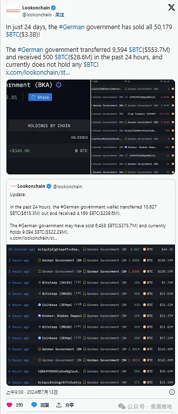 另据Lookonchain 监测数据,德国政府持有的所有50,179 枚比特币(约合33 亿美元)历时24 天完成清仓。