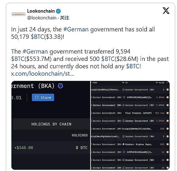 另据Lookonchain 监测数据,德国政府持有的所有50,179 枚比特币(约合33 亿美元)历时24 天完成清仓。