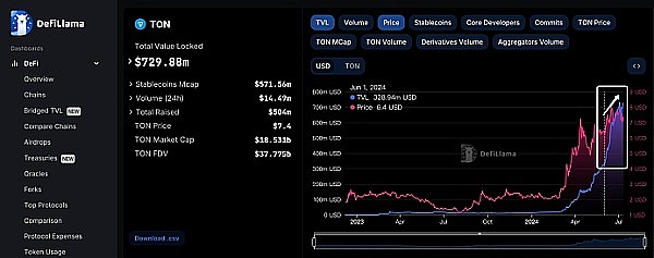 然而在大盘走势持续下跌的近一个月中,据DefiLlama数据显示,却有一个生态不仅锁仓量没减,反增4亿美元,币价也上涨近10%(截至本文撰写时间)。引起了业内诸多资本和研究者的格外关注,这也就是我们今天要讨论的主角:TON(The Open Network)。