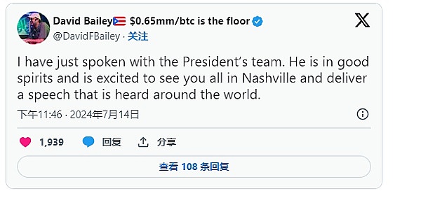 另一方面,Bitcoin Magazine 执行长David Bailey 稍早也发文确认,川普仍将在本月出席2024 年比特币大会并发表演讲。 ( 川普预计将于7/27 下午2 点发表30 分钟演讲)