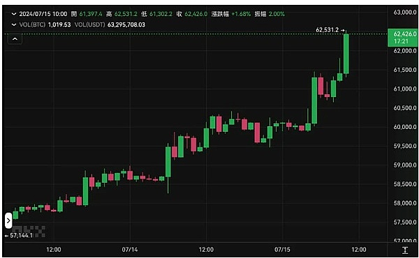 事件过后,有分析指出全球的投资者将会涌向避险资产,像是日圆、黄金与比特币,而BTC 今晨也延续周末以来的涨势,撰稿当下最高突破62,500 美元,V: tanzhangii 创下两周以来的最高点。