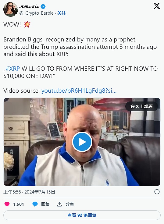 最近,XRP 社区成员发现了 Biggs 的一段预测视频,视频中他声称上帝向他讲述了XRP 的未来前景。在 Biggs 之前关于刺杀唐纳德·特朗普的预测于周六成真后,这段视频再次出现在加密货币社区。