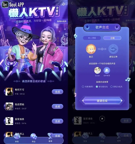 社交+游戏、社交+直播、社交+音视频……各大平台一直在丰富社交产品的玩法,以提升用户参与度和使用时长。Soul App创始人张璐团队主打“社交+AI”的创新模式,以用户兴趣为主导,实现AI赋能的应用场景。一方面,AIGC成为各类线上活动里的“鲶鱼”,通过帮助用户降低各种社交表达门槛,增强社区用户活跃度。此前,Soul上线了“懒人KTV”活动,用户录制30秒音频,即可生成专属声音模型,并能够通过均衡、相似度、表现力等三种AI唱歌模式,一键合成个性化音乐翻唱作品。“懒人KTV”有助于激发唱歌爱好者的分享欲,这也体现出多模态大模型在丰富社交玩法方面的重要作用。