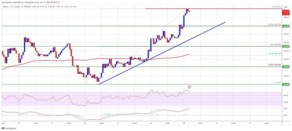 Solana 当下的交易价格高于 145 美元以及 100 小时简单移动平均线。在 SOL/USD 对的小时图上,还构建出了一条连接的看涨趋势线,支撑位是 147 美元。