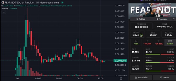 消息一发布,同名迷因币即在Solana和以太坊上迅速推出,Dexscrenner 数据显示,流动性较好的是Solana 链上的$FEAR NOT 代币。该代币发布后仅三小时内,价格从0.00005672 美元飙升超过100 倍,达到0.005773 美元,但随后迅速下跌,重挫近九成。