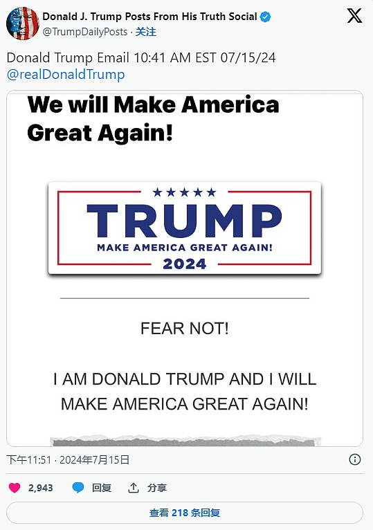 川普发布新邮件写道:不要害怕