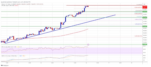 高点形成于 64,900 美元,目前价格正在巩固涨幅。目前交易价格远高于从 62,320 美元的摆动低点到 64,900 美元的高点的 23.6% 斐波那契回撤位。在 BTC/USD 对的小时图上,还形成了一条主要的看涨趋势线,支撑位为 62,200 美元。