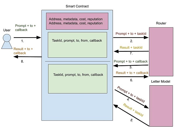 在操作方面,用户可以通过与前端交互来提交查询需求。这些查询会被提交给智能合约进行随机处理和事件广播。接收事件的路由会对其性质和所需任务进行分析,然后将任务分配给合适的专用模型。