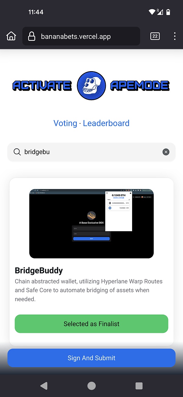 BananaBets 提供了一个预测平台,让观众可以在平台上对他们认为会入围 ETHGlobal Brussels 黑客松决赛的各个项目进行投注。一旦结果公布,平台将生成一个排行榜,根据观众的投注情况计分(投注错误记负分,投注正确记正分)。得分最高的人将赢得 100 USDC 奖励。