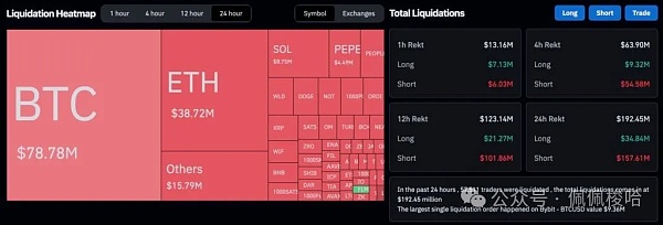 比特币拉涨的行情下,据Coinglass数据显示,过去24 小时,加密货币全网爆仓金额已破1.9 亿美元,有超5.7 万人遭清算(空军占1.57 亿美元)。