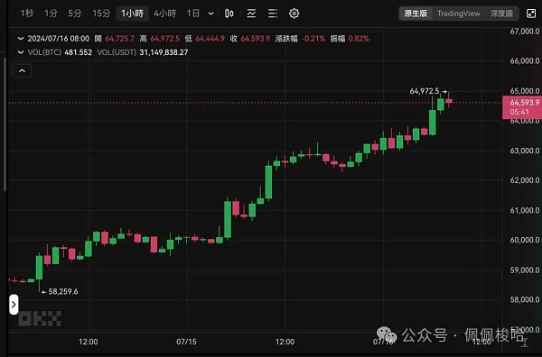 特币自上周末以来的反弹持续,撰稿当下一度逼近65,000 美元、近24 小时上涨5.87%。创下6/21 以来的最高点、相较7 月初的5.3 万低点,已经上涨超20%。