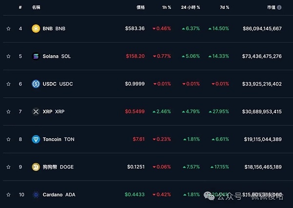 比特币拉涨趋势下,其他前十大代币也同步上扬。近24 小时涨幅最多的是DOGE 超7%,其他如BNB、SOL、XRP 也都有5~6 %的涨幅。