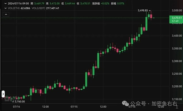 以太坊走势也与比特币接近,截稿前最高来到3,498 美元,近24 小时上涨5.81%。
