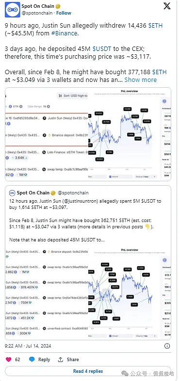 Spot On Chain 最近在社交媒体上分享了孙宇晨从币安提现 14,436 ETH,价值近 4550 万美元的消息。据报道,此次提现发生在三天前向该交易所存入近 4500 万美元 USDT 之后。每个 ETH 的购买价格约为 3,117 美元。