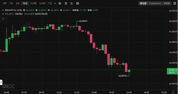 尽管目前难以确切知晓这 9 万枚比特币是否是转移至交易所用于还款(也可能是官方钱包的整理行为),但此情况已然在社群中引起了恐慌,BTC 在今日午后触及 6.5 万美元后便持续震荡下跌,截至撰稿时,其价格已报 62,369 美元,近 24 小时内反而下跌了 0.56%。
