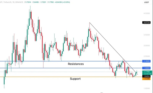 然而,新的下行势头可能会使价格回到趋势线,甚至再次回到 1.54 美元的基点。从中期来看,WIF 可以充分利用比特币的下一次上涨。如果 BTC 能够再次创下历史新高,预计 WIF 至少也能做到同样的事情,达到 4.85 美元。