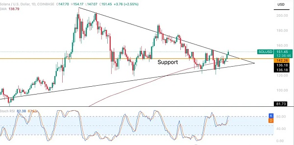 分析每日时间范围内的 $SOL,可以注意到周一出现了突破。这是在周日 142 美元阻力位转为支撑位之后发生的。随着短期随机 RSI 触顶,$SOL 价格是否能保持在三角形模式之外还有待观察。$SOL 需要每日蜡烛图收于上方,才能确认这一突破。