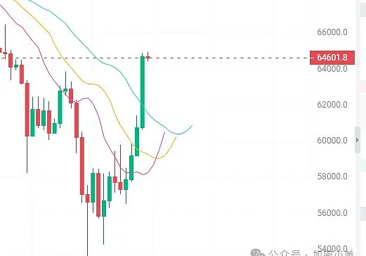 大饼从底部起来,现涨了21.54%,反弹11483刀,比上一次的日线反弹2浪还差3000刀左右。接下来应该会有个回踩的动作,回踩的时候会确认日线的趋势。BTC日内压力可关注:65470/66160/66900