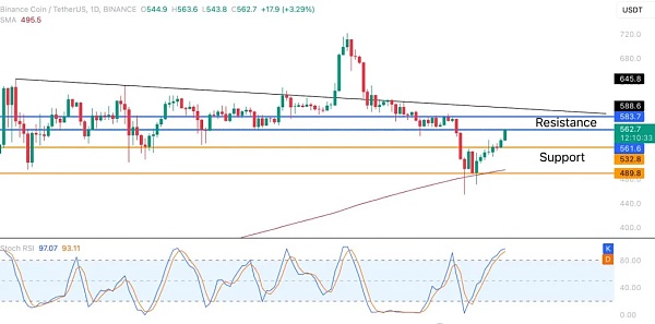 $BNB 价格已从 489 美元的支撑位反弹,这也与 200 日移动平均线的上涨相吻合。此后,$BNB 已从 532 美元的阻力位转为支撑位,现在,价格面临 561 美元的阻力位。鉴于短期时间框架随机 RSI 指标已达到顶峰,预计可能会突破这一阻力位。