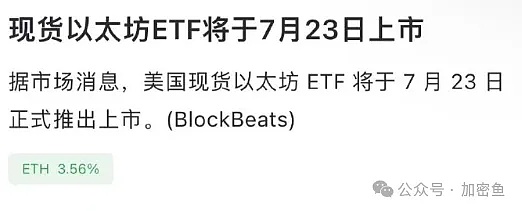 先前曾精准命中比特币ETF 上市时程的彭博高级ETF 分析师Eric Balchunas 今日凌晨也同样在社群平台上表示,以太坊现货ETF 将在7 月23 日推出。