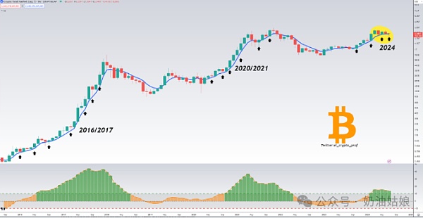 根据一位受欢迎的加密货币交易员的技术分析,价格已经从一个多月的下跌趋势中恢复。匿名市场分析师Moustache 在7 月16 日的X 帖子中写道:“比特币又回到了最重要的牛市线之一(蓝线)上方。在之前的周期中,它从未跌破该线,直到周期顶部(月收盘价)。这是一个强烈的信号,表明牛市远未结束。”