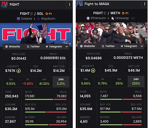7 月 14 日,特朗普在一场竞选集会中演讲时耳部中枪,在被安保掩护的过程中还高举右拳并高呼「Fight」,在新闻发布后仅 15 分钟,Solana 上就涌出了 24 枚 FIGHT,其中涨势最好的 FIGHT 发布于 14 日上午 6:50。而以太坊上的 FIGHT 虽数量与 Solana 相当,但最早出现的 meme 于 14 日上午 9 点,较 Solana 慢 2 个小时。