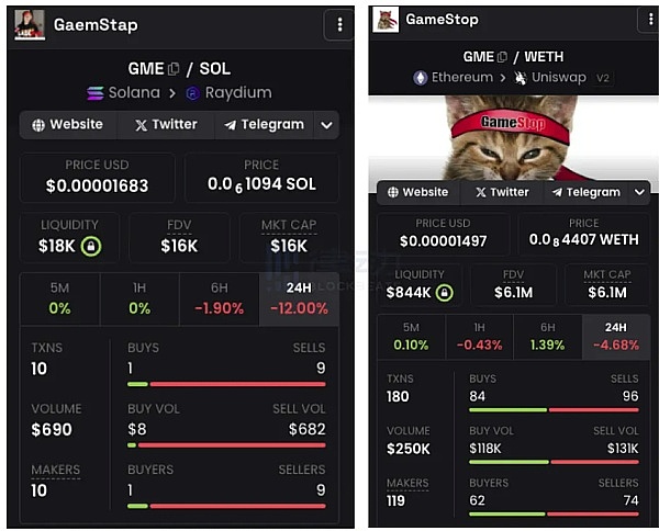 左图为 Solana 上的新 GME,右图为以太坊上的 GME
