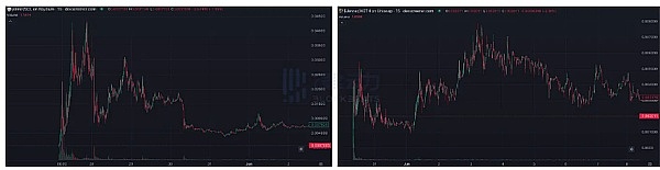 JENNER 在 Solana 上仅用一晚就实现了 160 倍的涨幅,但仅发币 3 天后就有明显的归零趋势。而以太坊上的 JENNER 在发布 3 天后达到局部高点,随后 6 月 11 日,即发币后的一个多星期仍能达到 0.007 美元的价格突破新高,此后也依旧在 0.005 美元上下维持了数周,直到 7 月初才开始有明显下降趋势。