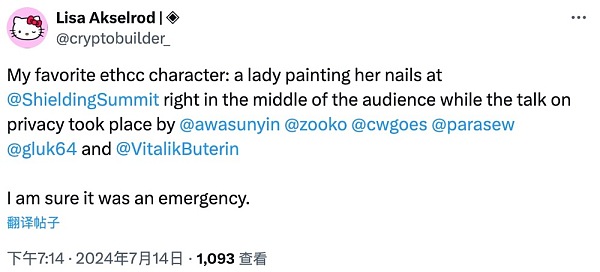 作为技术盛会,EthCC 讨论这些似乎并无槽点,但 Blockworks 联合创始人 Mike Ippolito 却评价表示,「去年,我满怀热忱地结束了 EthCC 之旅,但今年我很难找出活动的共同主题。周边活动数量过多导致整场活动十分割裂。最糟糕的是,没有应用」。DeSci 资助平台 Molecule 团队成员及前 Bancor 增长负责人 Nate Hindman 也评价道,其在此次会议期间最常听到的评价就是「无聊」。Unstoppable Domains 首席运营官 Sandy Carter 在福布斯撰文指出,「会议深入探讨了协议优化、智能合约安全和扩展解决方案等复杂的主题,为有技术背景的人提供了深刻的见解。但是,针对没有技术背景的商业领袖、政策制定者和区块链领域新手的内容明显不足。」有趣的是,@cryptobuilder_ 分享的一个故事侧面印证了此次会议「多技术,少应用」的问题。据其描述,在 Vitalik 与 zkSync 创始人 Alex Gluchkowski 等人就隐私主题展开小组讨论时,坐在观众席正中间的一位参会者直接涂起了指甲。