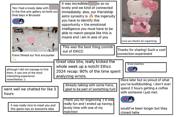 类似的,@amelia_guertin 在 EthCC 期间操办了一场名为「Crypto Soulmates」的社交实验。Amelia Guertin 表示,「很多加密从业者沉浸在自己的小圈子里,无法结识新朋友或建立更深层次的联系。」为此,她设想通过收集本届 EthCC 参会者的兴趣、价值观、个性特征以及钱包地址(了解链上行为)来为加密社区的人们「牵线搭桥」。Amelia Guertin 称,实验最初设定的目标是 30 人,但有 150 人填写了问卷,最终有 120 人实际参加了活动。从参与者的反馈来看,此次活动反响良好。