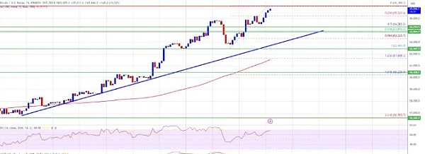 在66,100美元处形成高点,价格现在正在巩固涨幅。它的交易价格远高于从62,466美元摆动低点向上移动至66,100美元高点的23.6%斐波拉契回撤位。在BTC / USD货币对的小时图上,还有一条关键的看涨趋势线形成,支撑位在63,850美元。