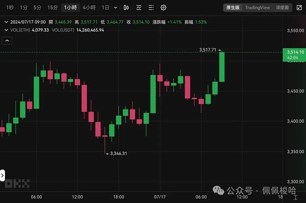 以太坊走势也与比特币接近,截稿前最高来到3,517 美元,近24 小时上涨1.03%。