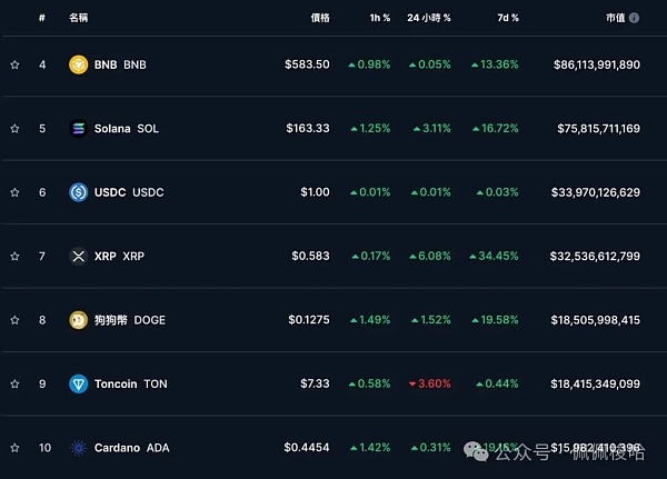比特币拉涨趋势下,其他前十大代币也同步上扬。近24 小时涨幅最多的是XRP 超7%;不过近期的黑马公链TON 则是逆势下跌了3.6% 报7.33 美元。