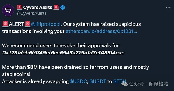块链安全机构Cyvers Alerts 昨(16)日稍晚在X 上警告,其系统监测到跨链交易聚合平台LI.FI 疑似遭遇骇客攻击,受影响的用户资金超过了800 万美元,建议用户赶快撤销钱包授权: