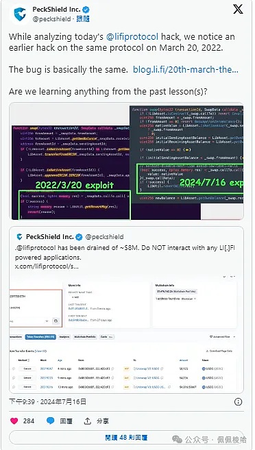 但令社群愤怒的是,安全机构派盾(P eck Shield)在分析LI.FI 遭遇的此次攻击时指出,LI.FI 在2022 年3 月遭到攻击时,当时的漏洞与此次受攻击的漏洞基本相同: