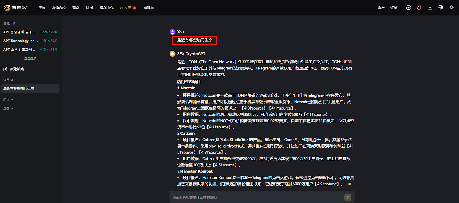CryptoGPT通过嵌入目前顶级的ChatGPT-4o接口,自动搜集整合加密市场上的最新信息,将分散的信息资源聚集筛选,挖掘出最有价值的信息。 比如:当提问到最近的热门生态时,CryptoGPT会收集目前市场上最新的信息,给出答案。