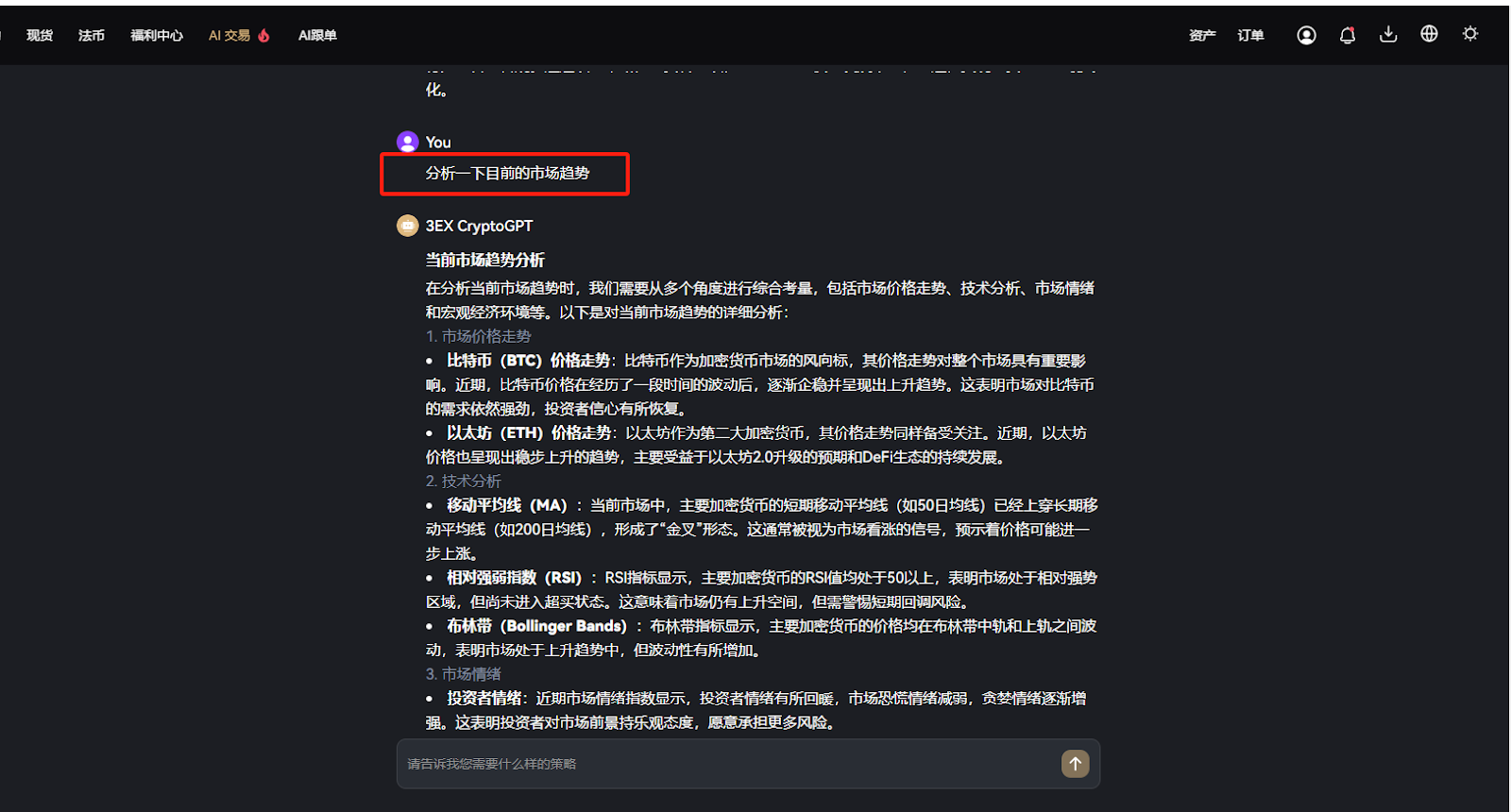 3EX CryptoGPT目前后台已经喂养了交易相关的知名书籍资料,并整合了加密领域优质的交易策略,CryptoGPT会通过AI技术根据加密行情趋势,市场信息,项目走势,历史数据等多重角度生成准确可靠的交易策略。用户可以根据AI生成的策略进行智能交易。同时投资者也可以根据自己的交易习惯,创建属于自己的策略。