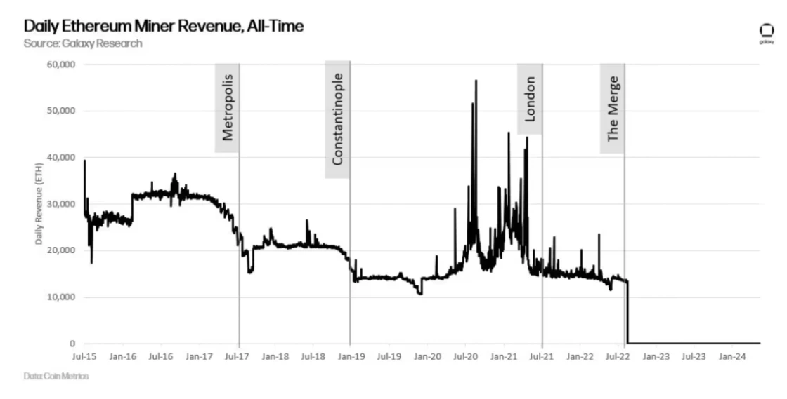 合并升级:2022 年 9 月,随着以太坊从工作量证明(PoW)转向权益证明(PoS)的合并升级,挖矿奖励在网络上被彻底废除。